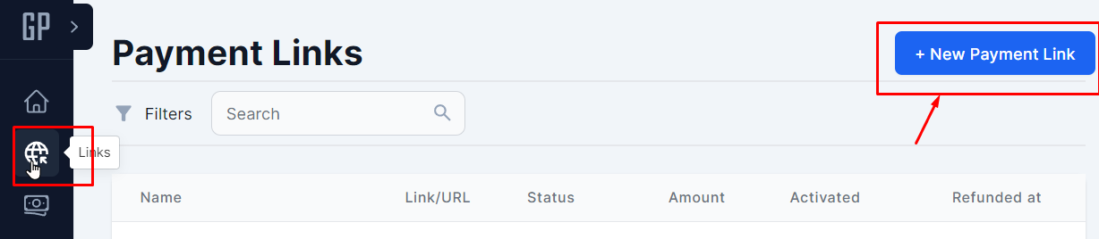 - Go to “Links” and click on the “+ New Payment Link” button on the upper right of the page
