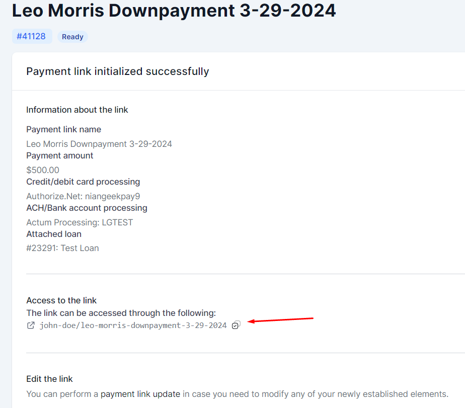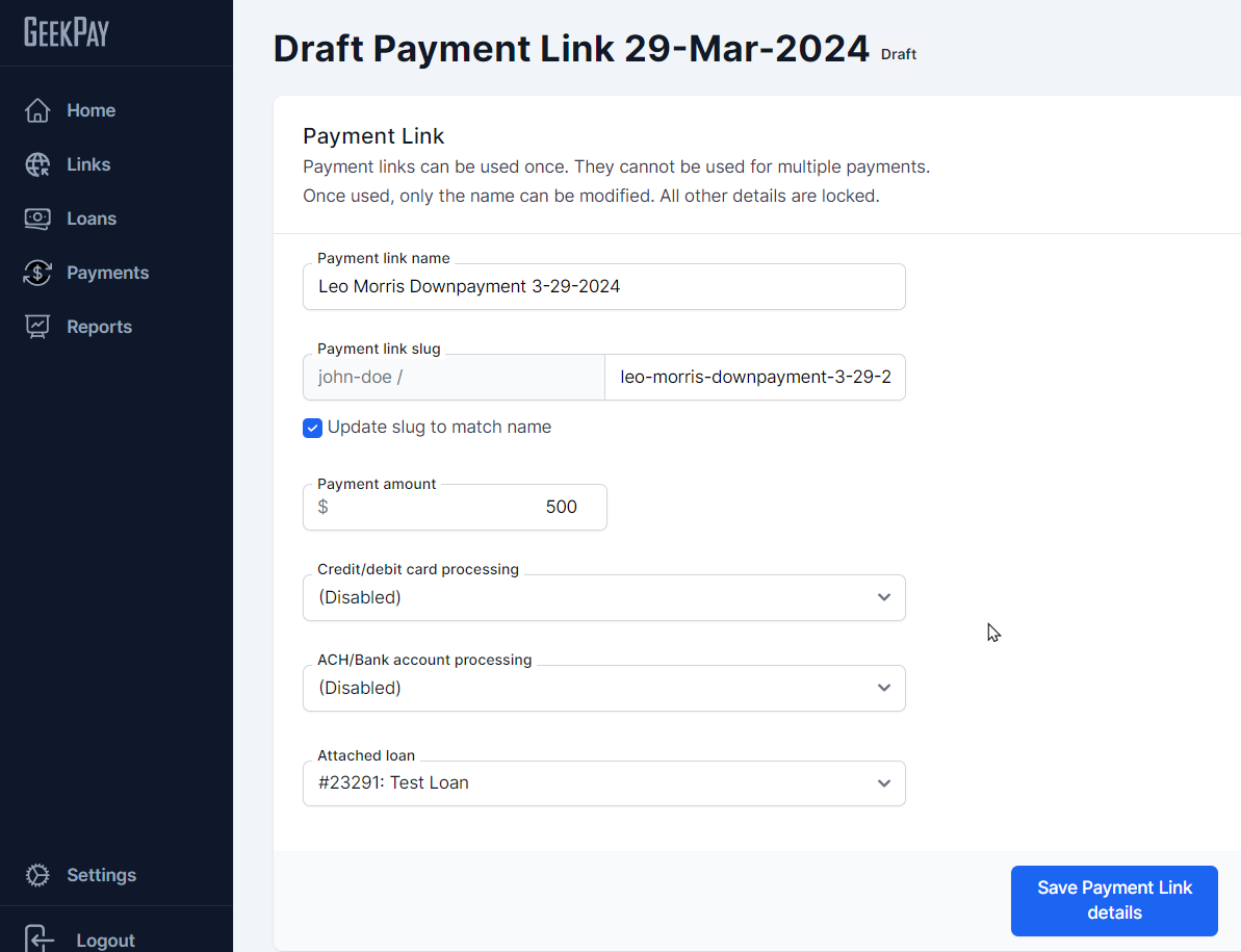 Payment links can be viewed as a basic payment form that enables any of your borrowers to come and make a one-off payment. If you wish to associate this payment with a loan after the fact you can do so. They are normally used for one time payments like a Downpayment.