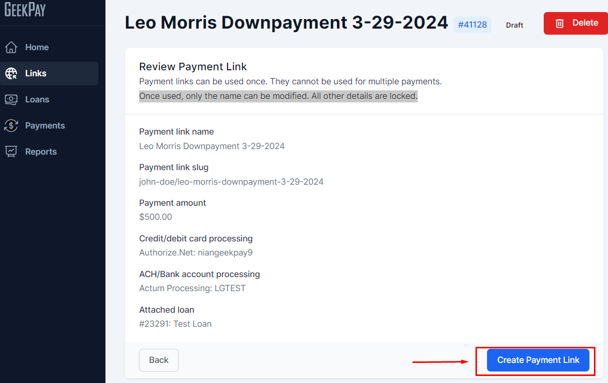 - Click on the button “ Save Payment Link Details” and on the next screen, you may review the details. Once used, only the name can be modified. All other details are locked. When ready, click on “Create Payment link “ button.