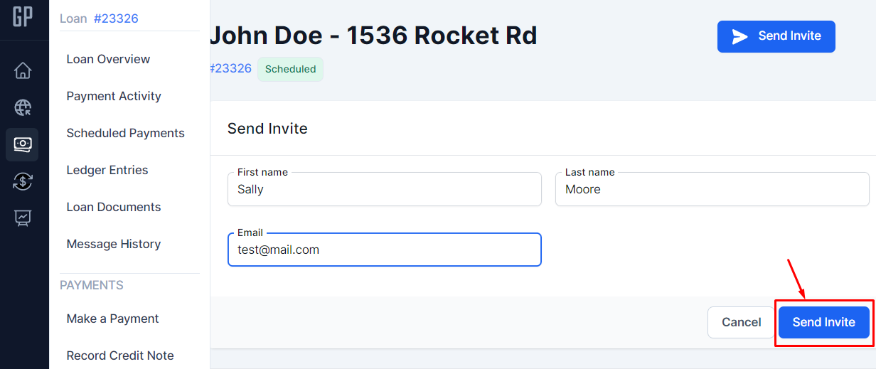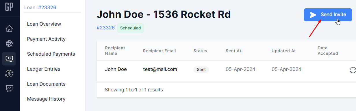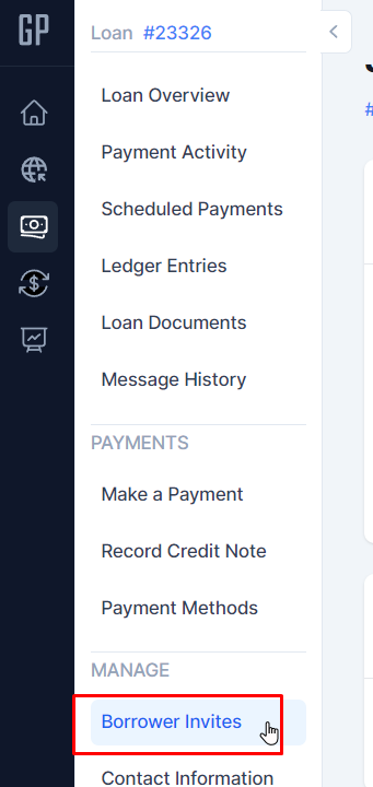Inviting the Borrower Once a loan is set up, you can start inviting your Borrower so they can view the loan and make payments.You may do this through the "Borrower Invites" sectionClick on "Send Invite" buttonEnter the Borrower's name and email address then click on the "Send Invite" button No results found