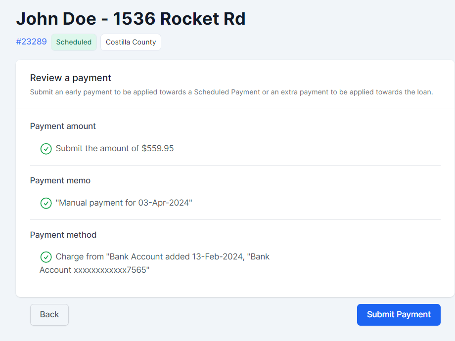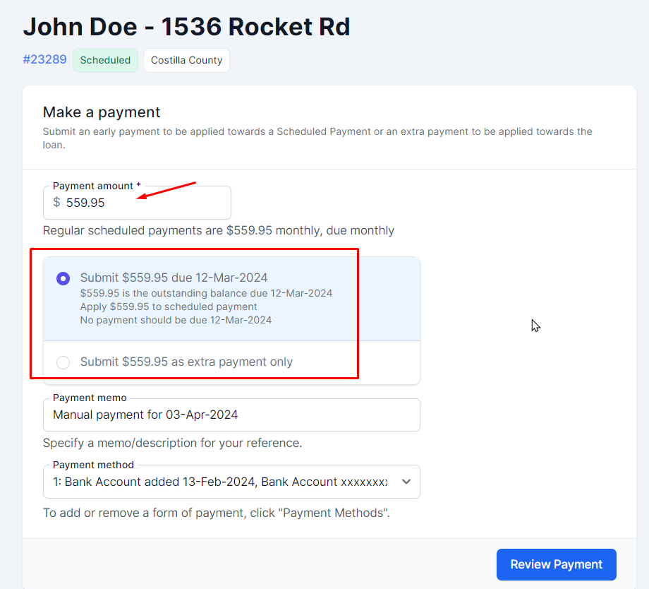 In the highlighted section, you have 2 options on how the manual payment will count towards the loan: