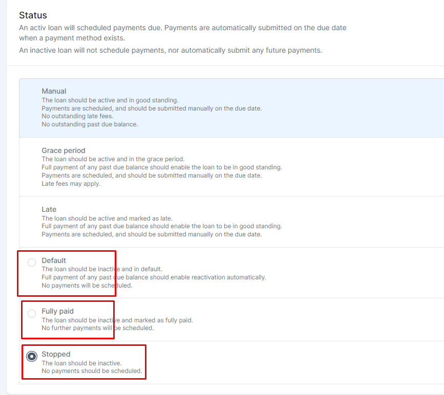 For the loan status: Some options may not be available in which case you will need to contact Support for assistance.