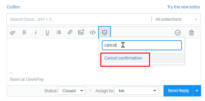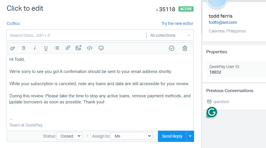 - Reply to the Merchant on Helpscout using the “Canel Subscription” template