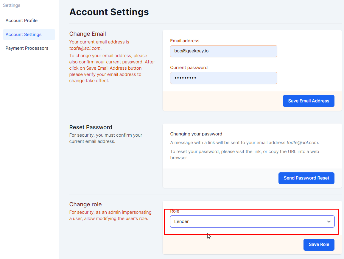- Go to Geekpay admin > Account Settings and ensure that the account is set to “Lender” role and hit “Save Role ” button.