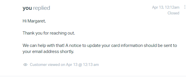- Reply to the Merchant on Helpscout using the “Send Subscription card update” template
