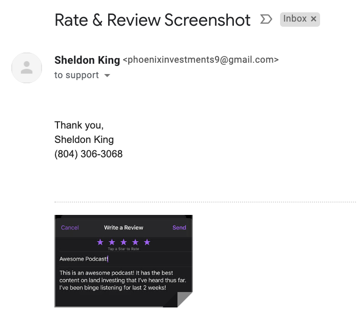 We have a deal for customers where if they rate and leave a review of our podcast, The Art of Passive Income, then we will provide them with free access to two of our training courses 1) Wholetailing and 2) The Passive Income Launch KitIn order to receive these two courses, the customer must send an email to support@thelandgeek.com with a screenshot of their rating and review. Once this is complete, you can use the response below to provide them access to these courses.Review of Podcast Example